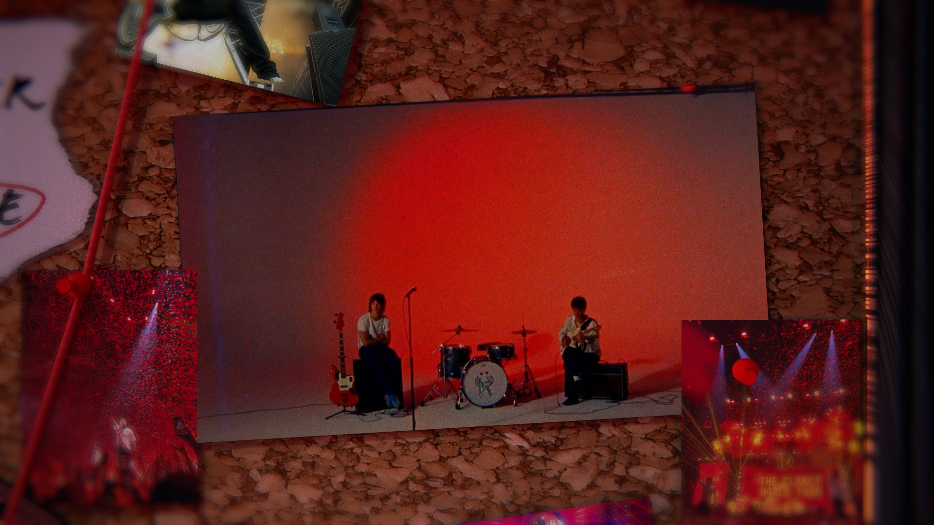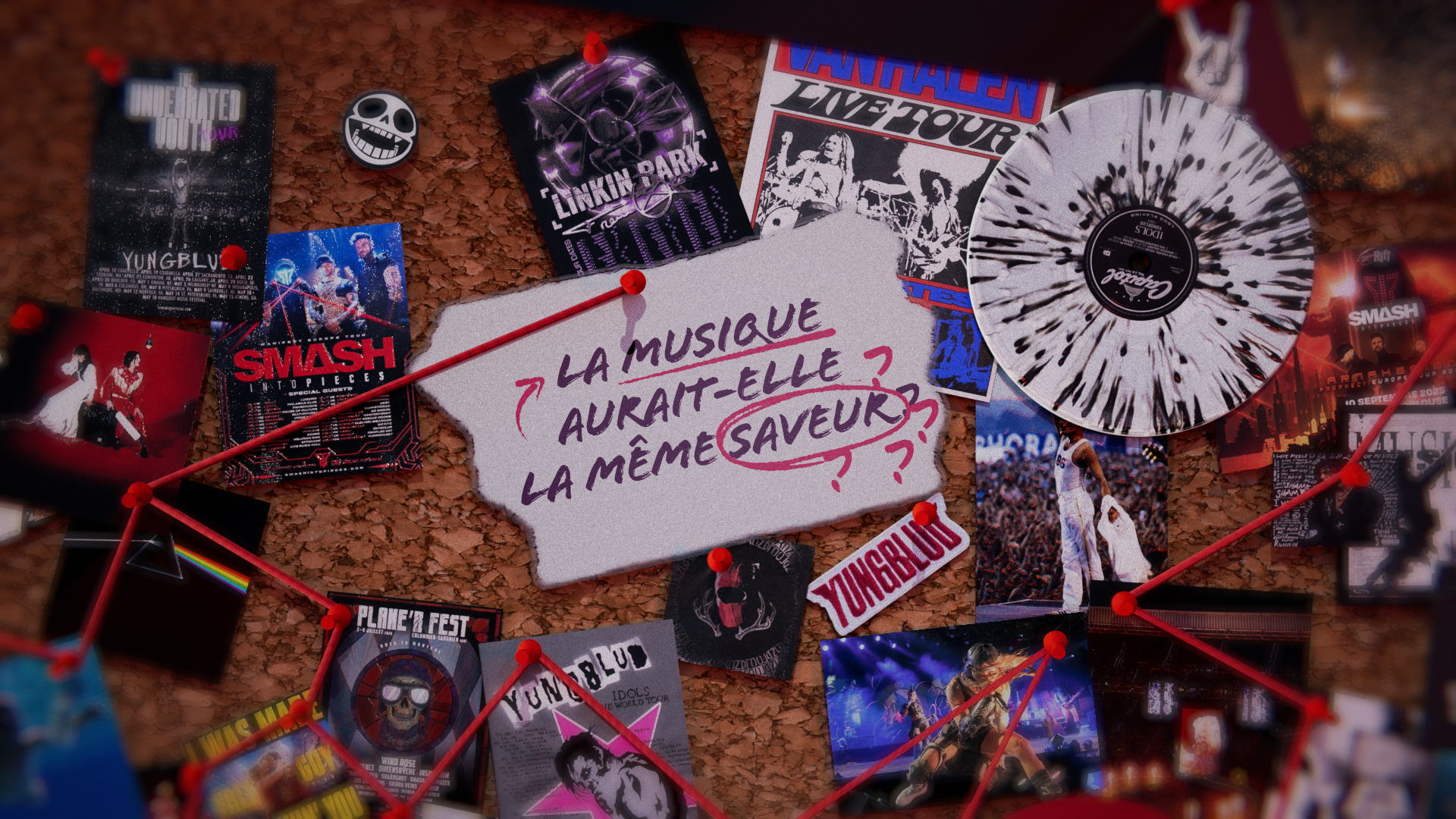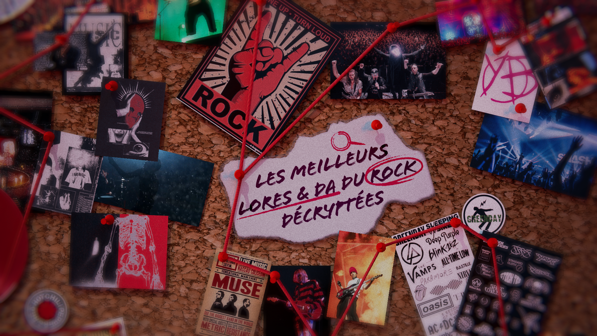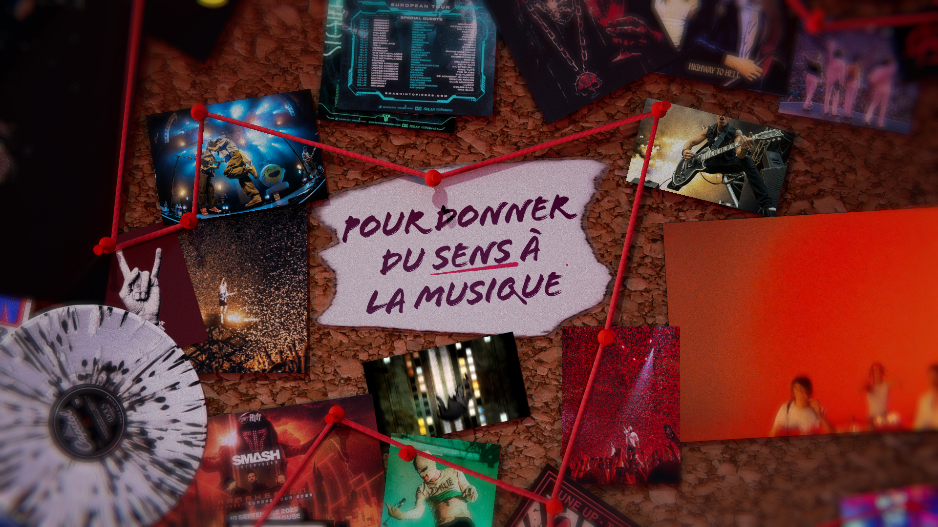 Pour ce projet réalisé en groupe, nous avons créé un teaser pour une émission fictive autour des directions artistiques de groupe de rock. Nous avons voulu retranscrire une ambiance d'enquête avec le tableau en liège et les fils rouges reliant les éléments. Le mouvement continu de la caméra accentue l'atmosphère mystérieuse tout en découvrant les différents titrages du teaser. Nous nous sommes servis du logiciel Cinéma 4D afin de créer en 3D toute la pièce et les mouvements de caméra puis nous avons utilisé After effect pour peaufiner les derniers effets et les textes.